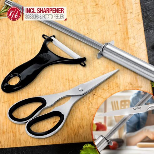 - 8-PIECE STAINLESS STEEL KNIFE SET: This NETTA Premium 8-Piece Stainless Steel Knife Set is the perfect addition to any kitchen. Featuring a great variety of knives as well as a stylish block holder, this set is sure to look good in your home. The ergonomic handles ensure that you can use these knives for longer periods of time without your hands aching.